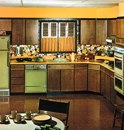 The ‘90s were also distinctive, with oak cabinets spanning entire walls, along with laminated countertops and tan (biscuit-hue, anyone?) appliances filling the space with contrasting colors.